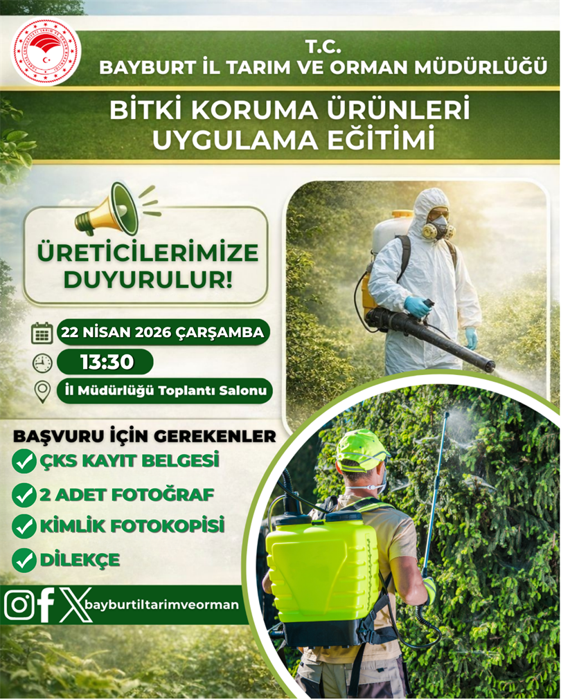 01.07.2026 tarihinden itibaren B-REÇETE sistemi üzerinden ilaç satışları yapılacaktır. Buna istinaden İl Müdürlüğümüz Toplantı salonunda 22.04.2026 Çarşamba günü saat 13.30'da B-REÇETE ile ilgili bilgilendirme ve Bitki Koruma Ürünleri Uygulayıcı Belgesi Eğitimi verilecektir. Üreticilerimizin 2 adet fotoğraf, kimlik fotokopisi, dilekçe ve ÇKS Belgesi ile katılım sağlaması gerekmektedir.