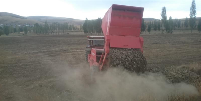 Hasat sezonunu tamamlayan ve yeni dönem için hazırlıklarına başlayan bazı çiftçiler, taşlı tarlalarını taş toplama makinesi aracılığıyla temizliyor. Büyük oranda verim kaybına neden olan tarladaki taşlar, İl Müdürlüğümüz Makine Parkı envanterinde bulunan taş toplama makinesi yardımıyla toplanıyor.