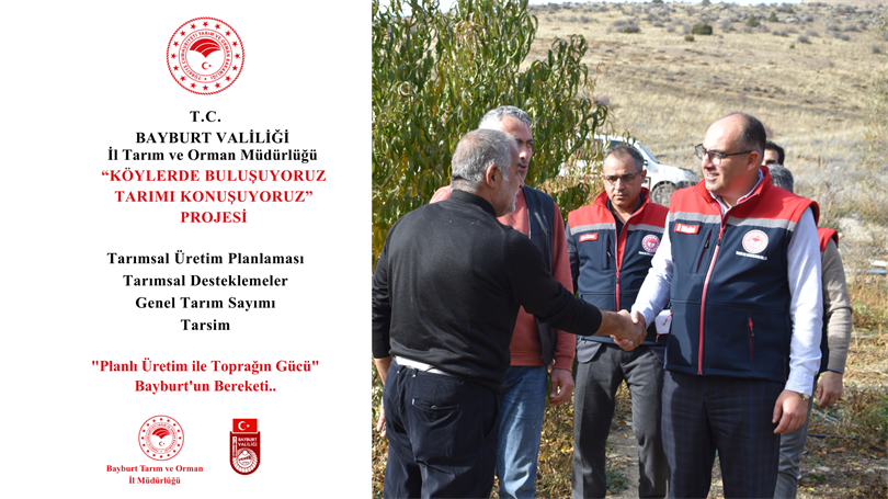 Bayburt İl Tarım ve Orman Müdürlüğü tarafından, 4 Kasım 2025 tarihi itibarıyla il genelinde "Köylerde Buluşuyoruz Tarımı Konuşuyoruz" projesi kapsamında çiftçi ziyaret programı başlatılmıştır. Program kapsamında İl Müdürümüz Sayın Ebubekir KÖSE ve teknik ekiplerimiz tarafından ilimizde toplam 79 köyde üreticilerle bir araya gelerek çiftçi ziyaretleri gerçekleştirilmiştir.